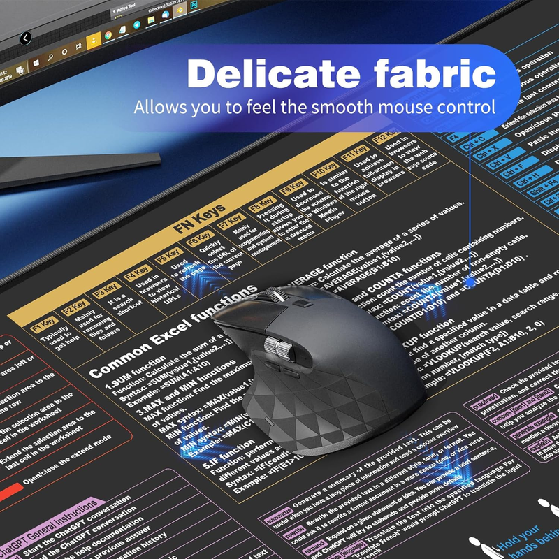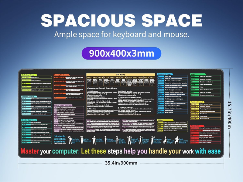 •Desk Protector: The 900mm x 400mm (35.4"x 15.7") 3MM thickness Excel Shortcut Mouse Pad offers a significantly larger workspace, enabling users to breeze through Excel tasks with ease. Featuring essential shortcuts, it enhances productivity and efficiency, while keeping your desk scratch-free.