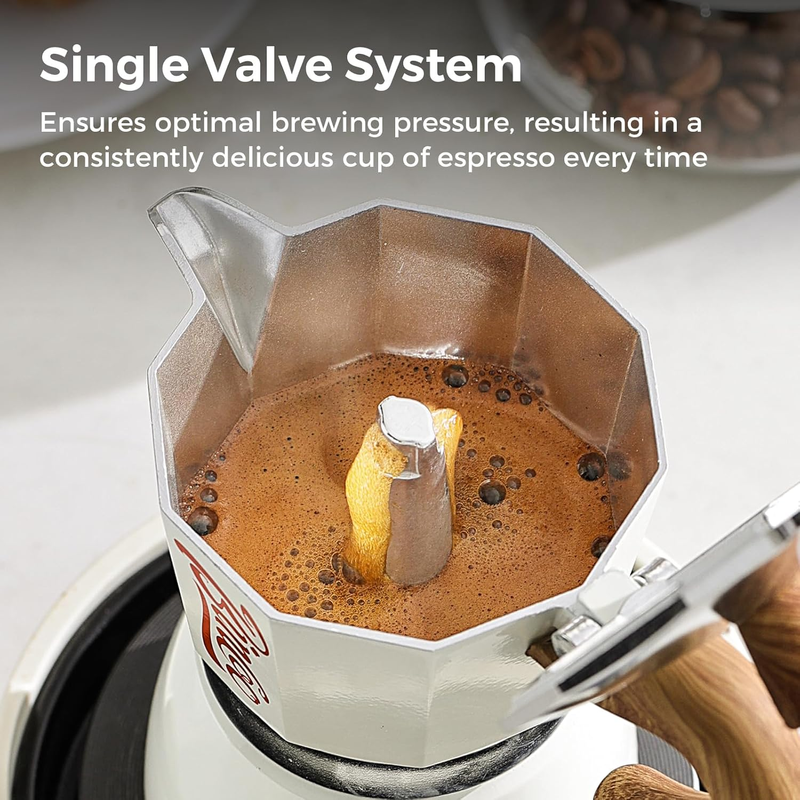 【Single Safety Valve】Equipped with a professional-grade safety pressure valve, this espresso pot automatically releases excess pressure when it builds up, eliminating the risk of over-pressurization