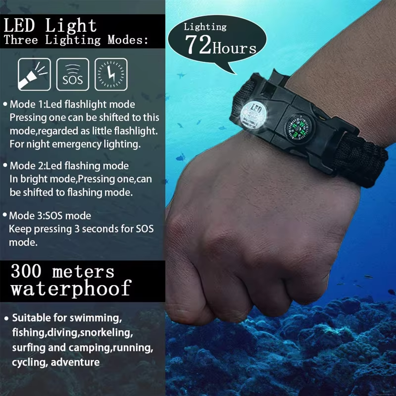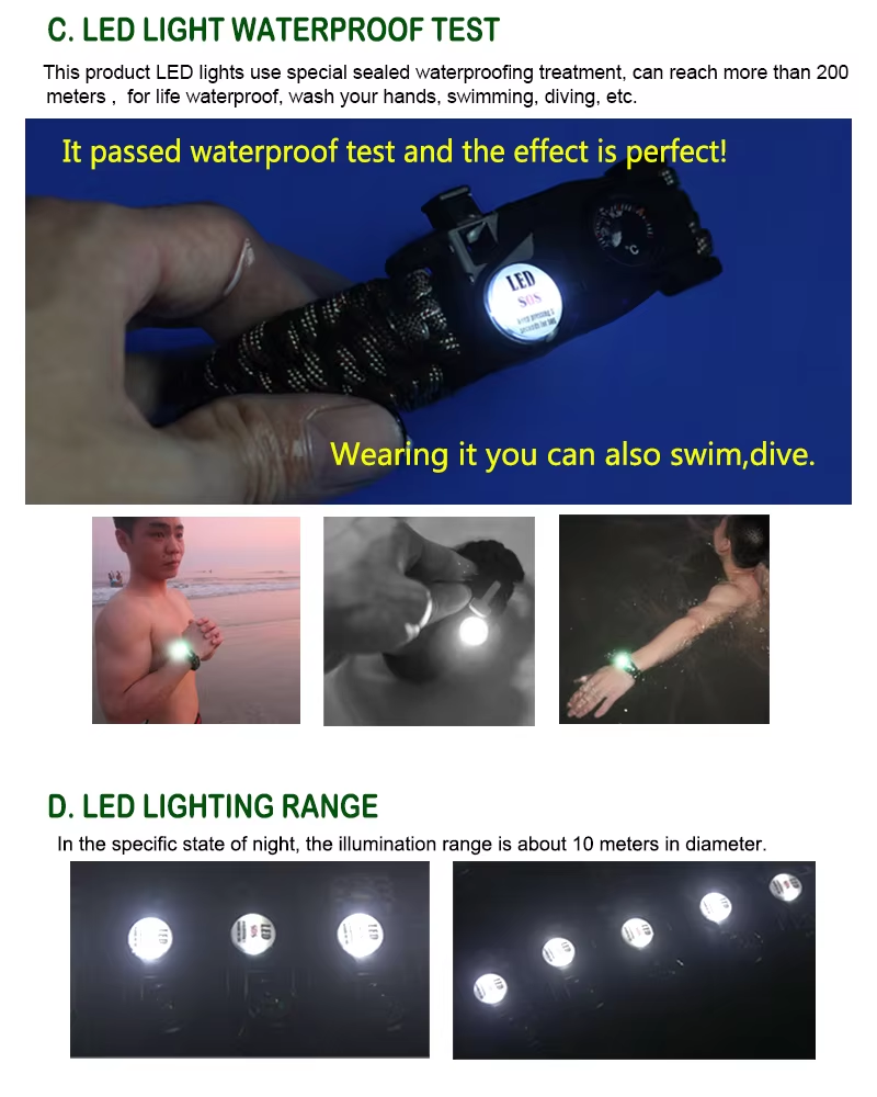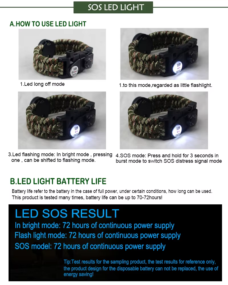【SOS LED Light】: It is a key to seek or implement rescue. The LED light has three modes: flash(press), lighting (press again), morse code rescue signal (press for 3s). Built-in battery can last for more than 18 hours. It is also bright enough to be seen within 32 feet/10 meters diameter in darkness.