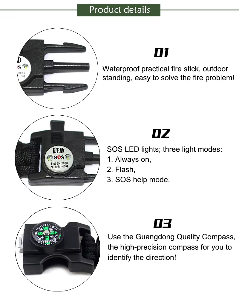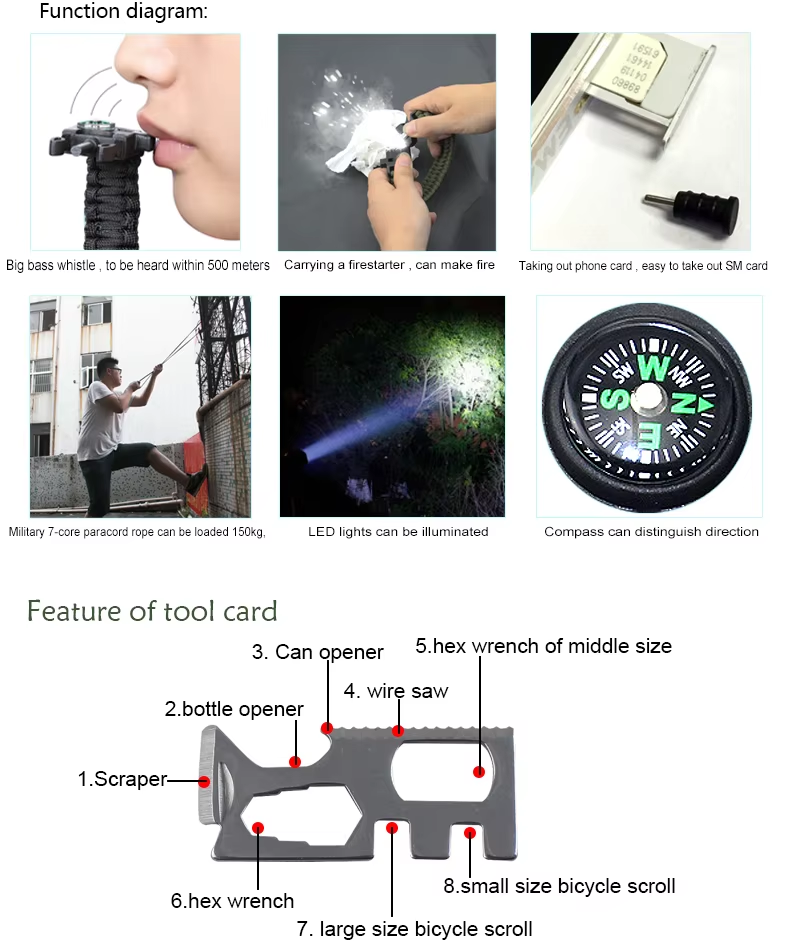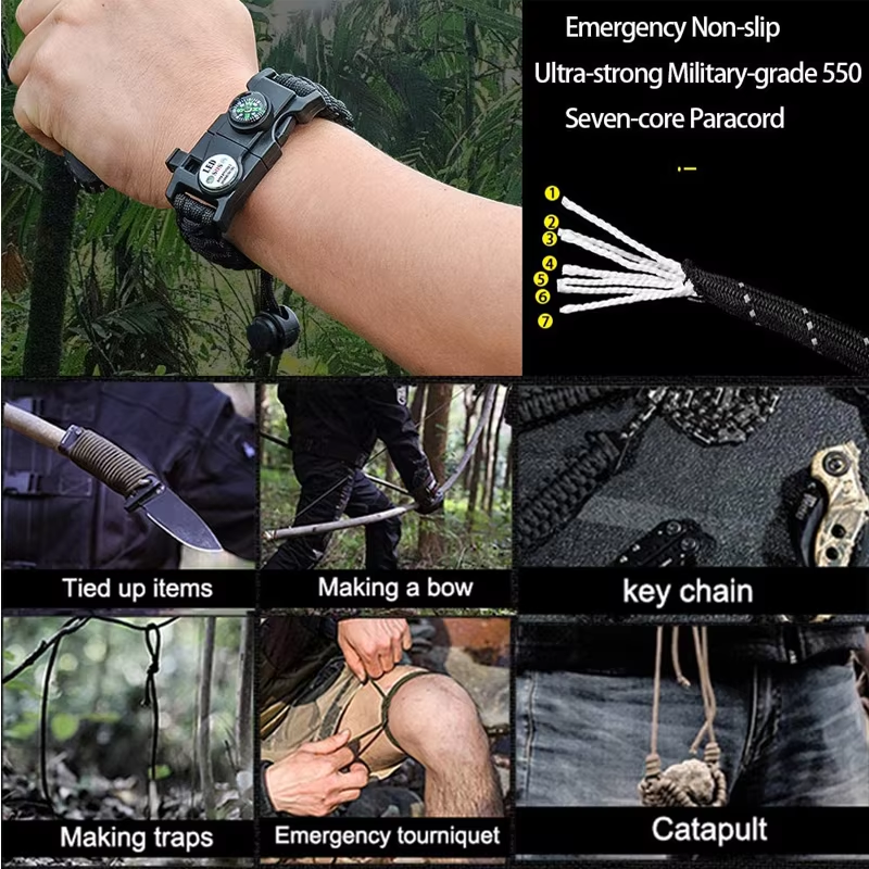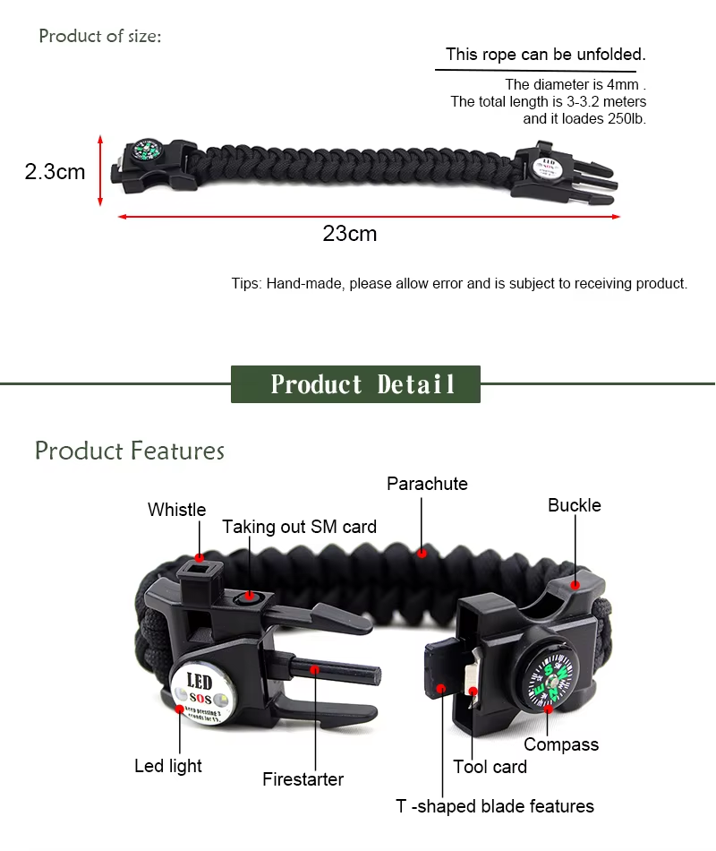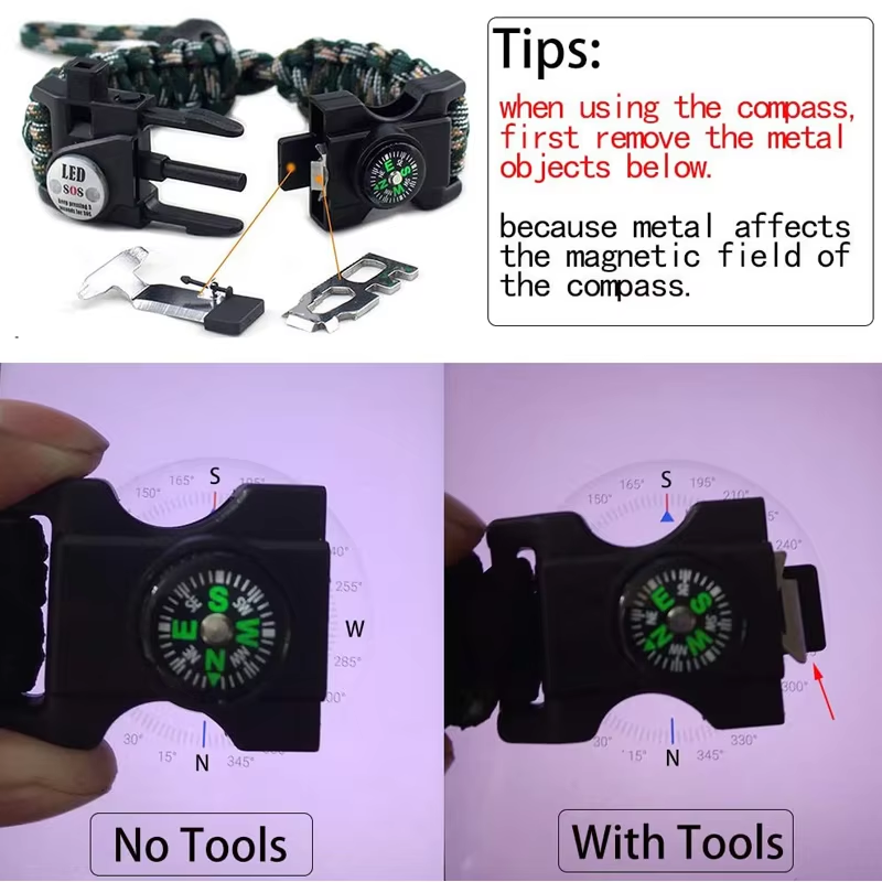 【10ft Paracord Bracelet & Thermometer】:The paracord can withstand weight up to 550lb (249kg); paracord bracelet can be loosen up to 10 feet in any situation when strong rope or cordage is needed. Good to stabilize a tent to build a shelter, create hunter traps, hiking rope and so on. Thermometer is ideal to know local real-time temperature quick(in Celsius)