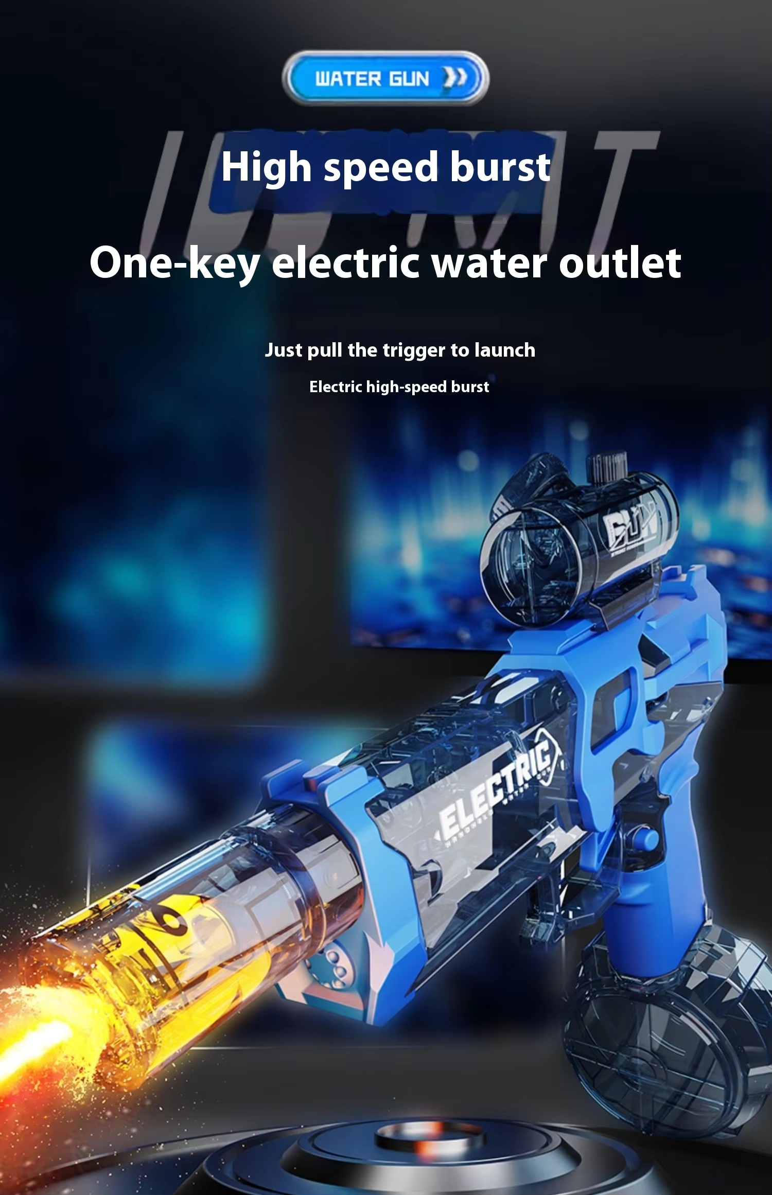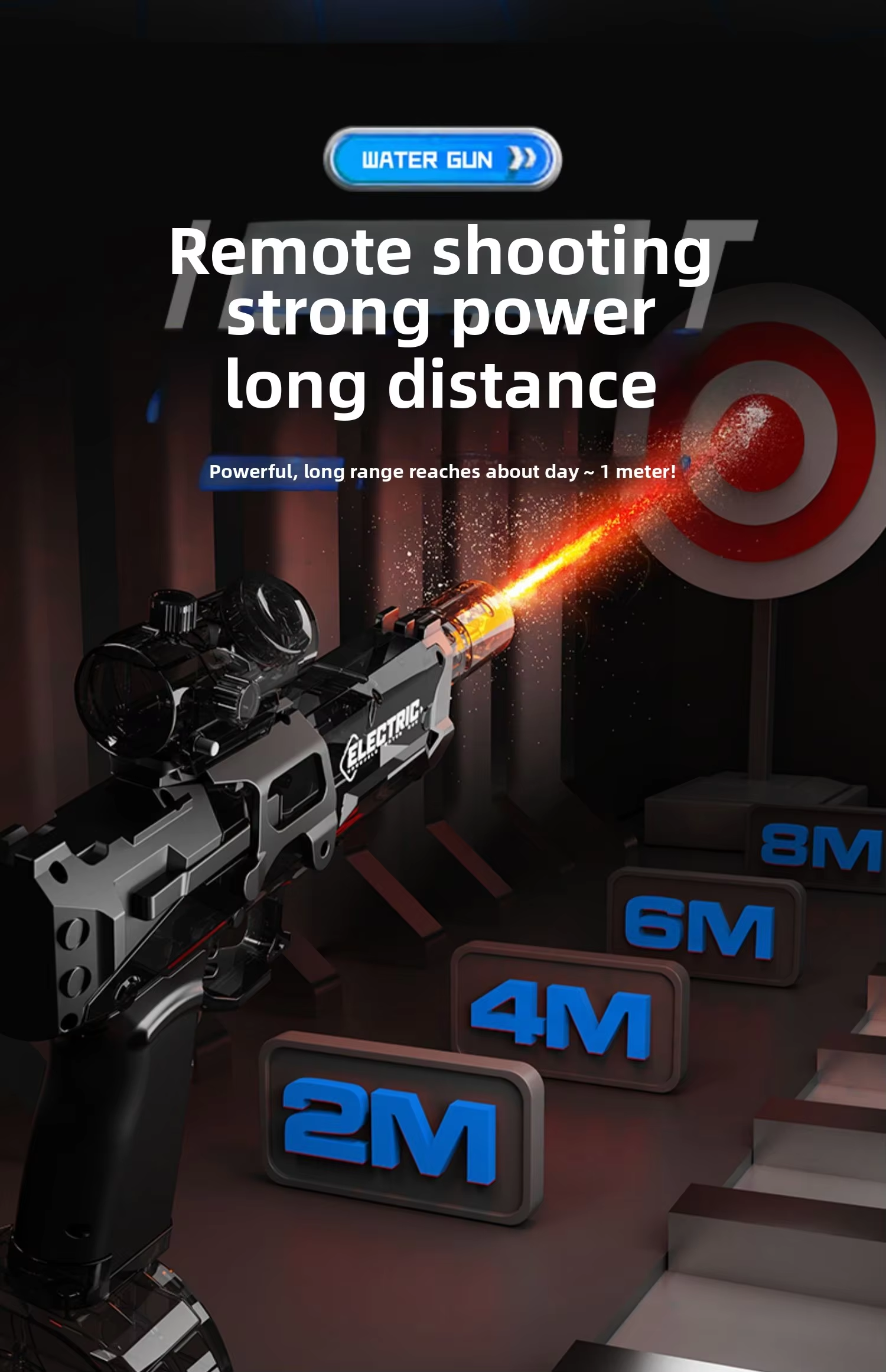 These electric water guns have 2 tanks, just press the trigger - Press once for one spray of water, short range and the second time hold the trigger of the water gun longer and it will have continuous long range water spray. This water gun has a shooting range of up to 8-10m.