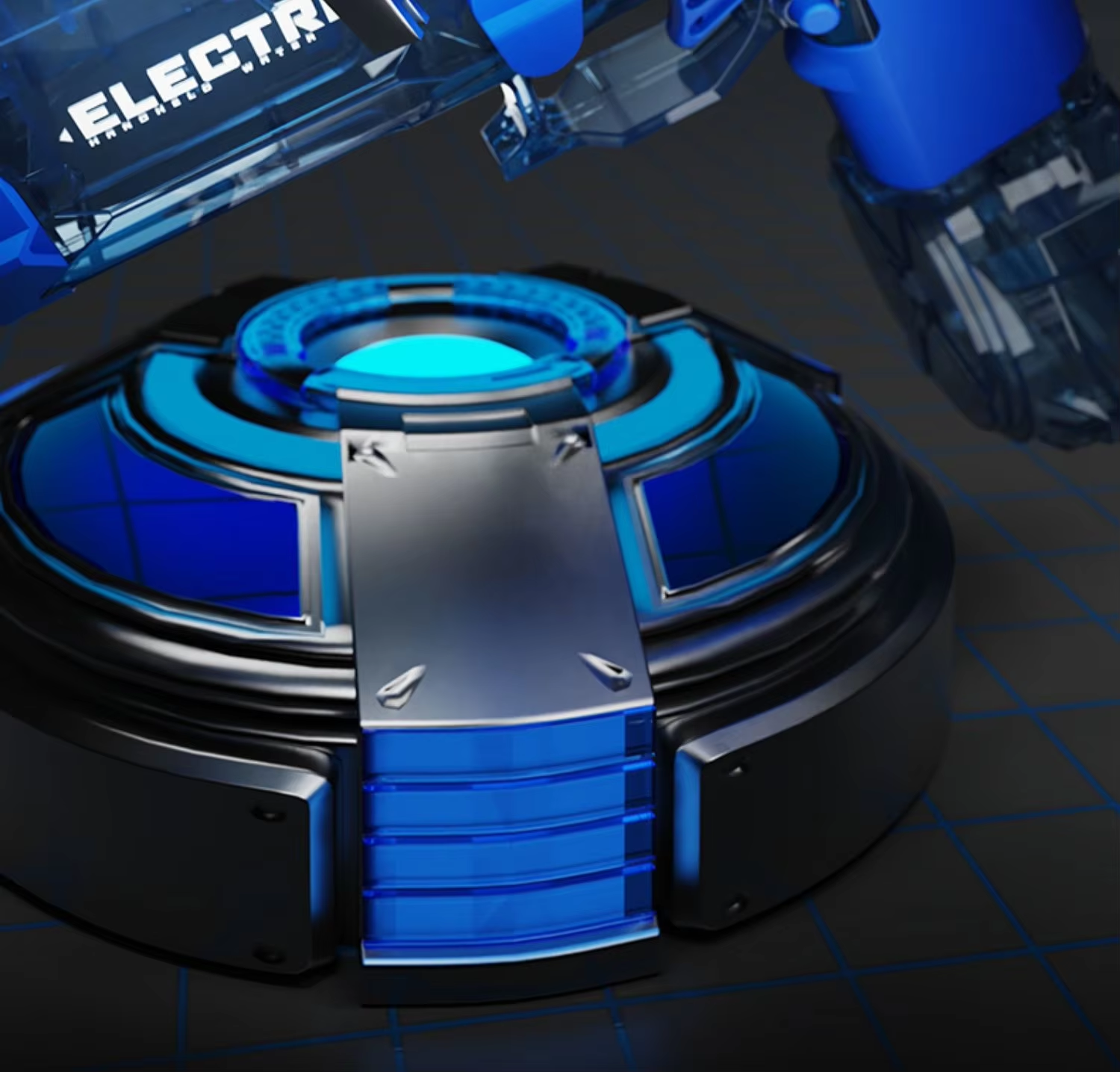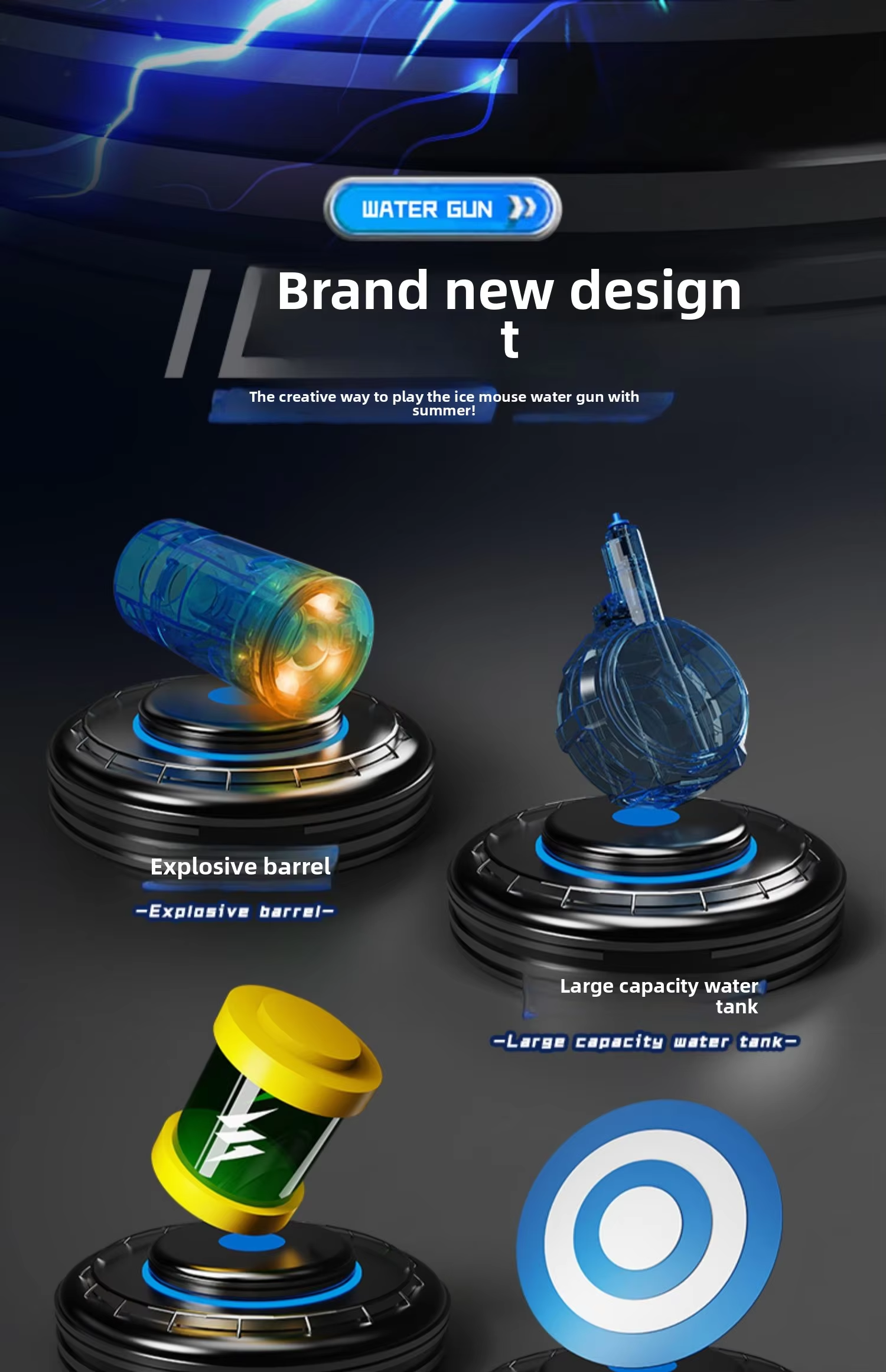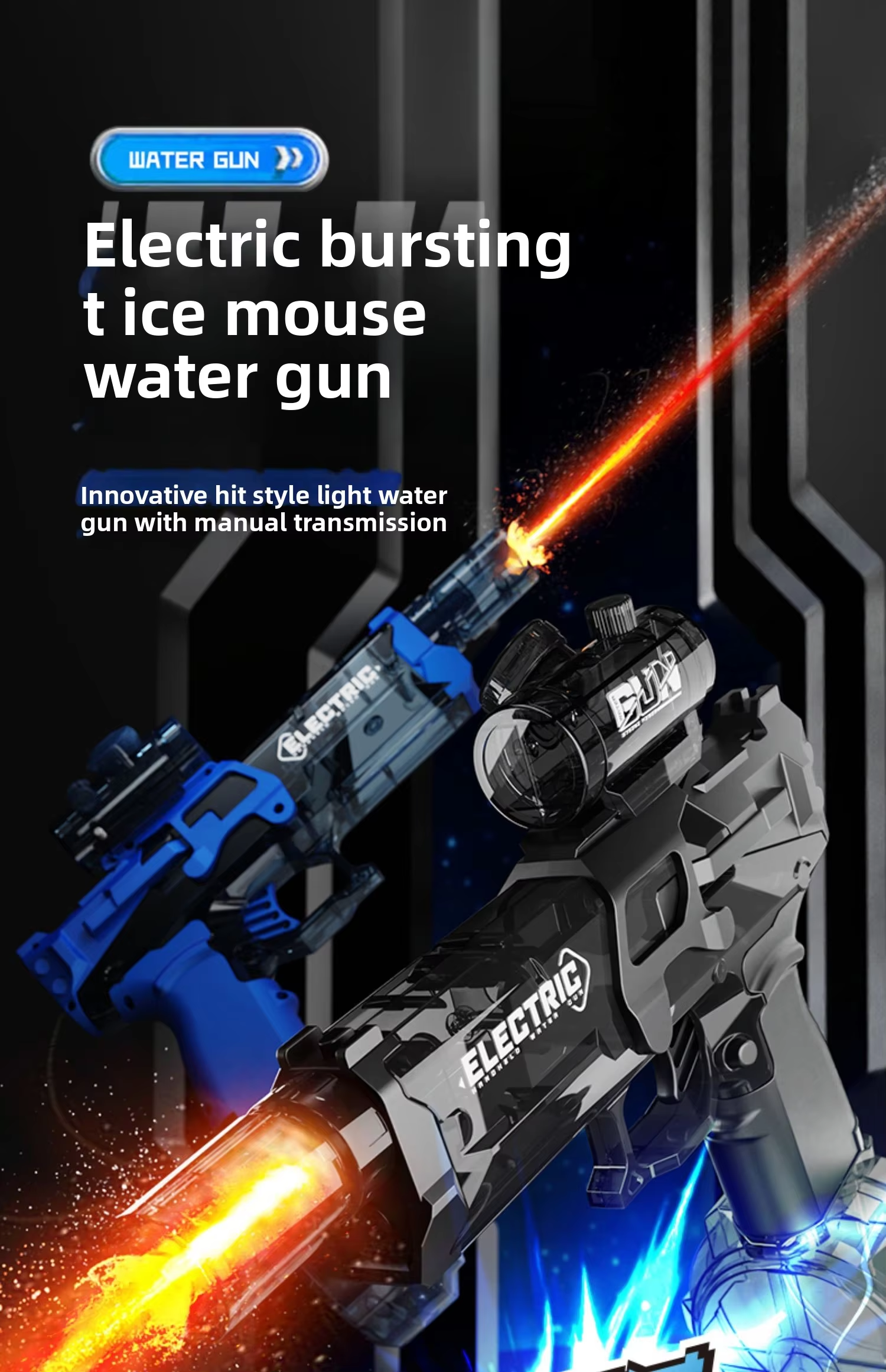 This water gun adopts a fully transparent gun body design, and the internal device is clearly visible. When the trigger is pulled, the push rod will also drive the expansion and contraction of the gun tail, and the design concept of technology is vividly reflected.