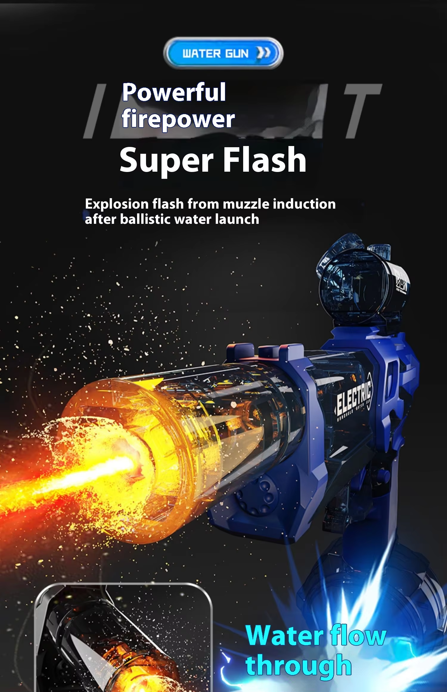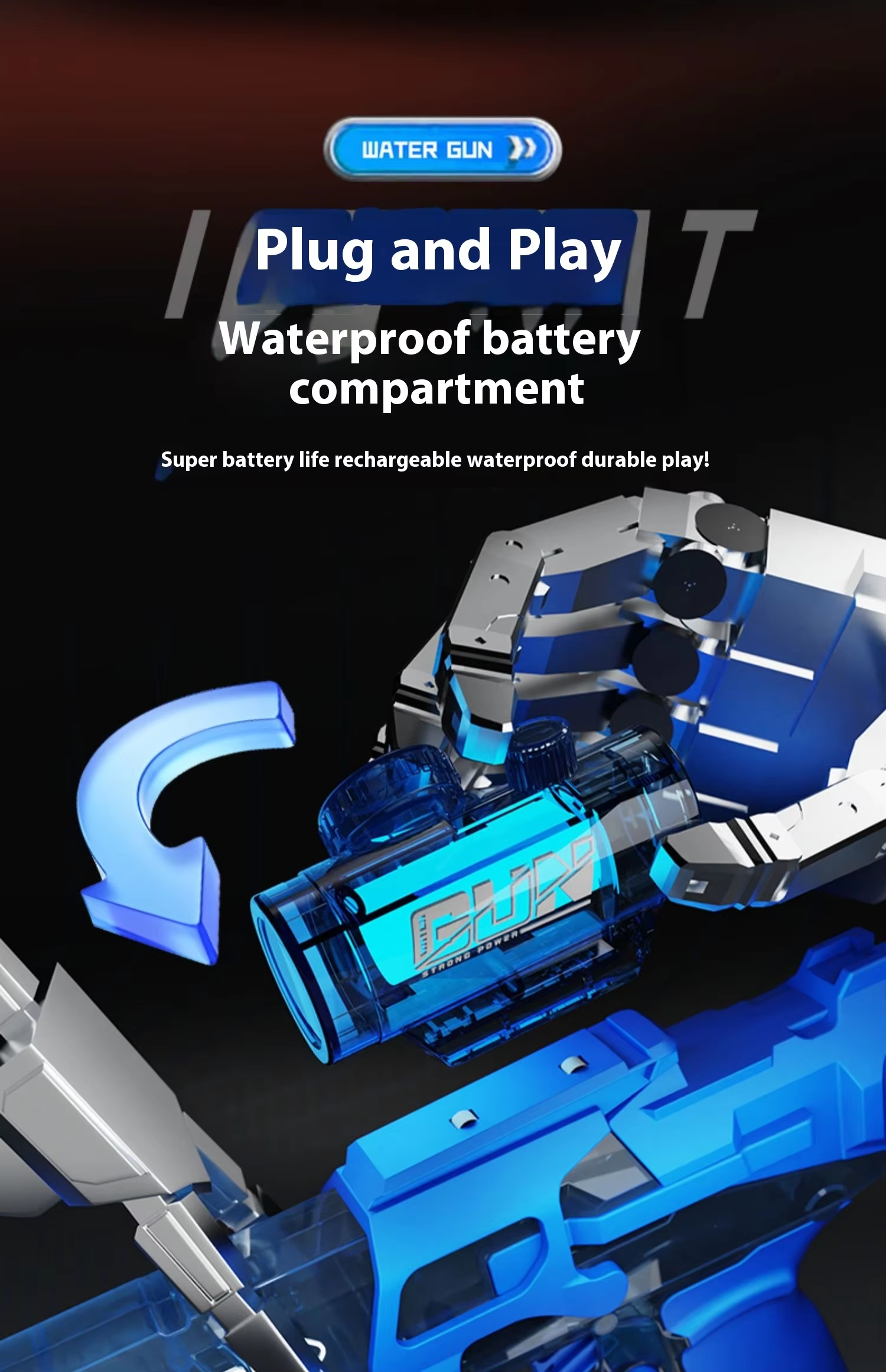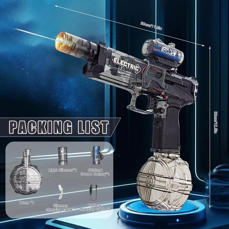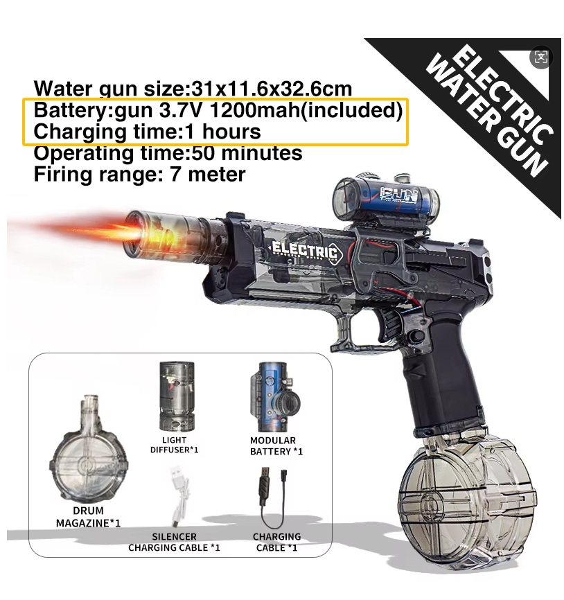 Using a 1200mAh large-capacity rechargeable battery, it can play continuously for 1 hours when fully charged, which is much higher than other similar water guns on the market.