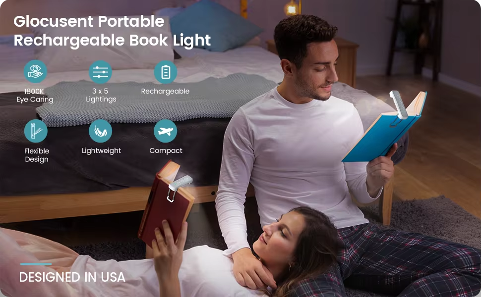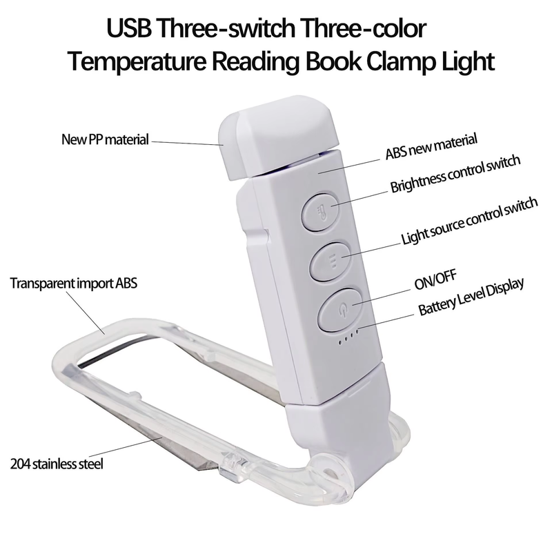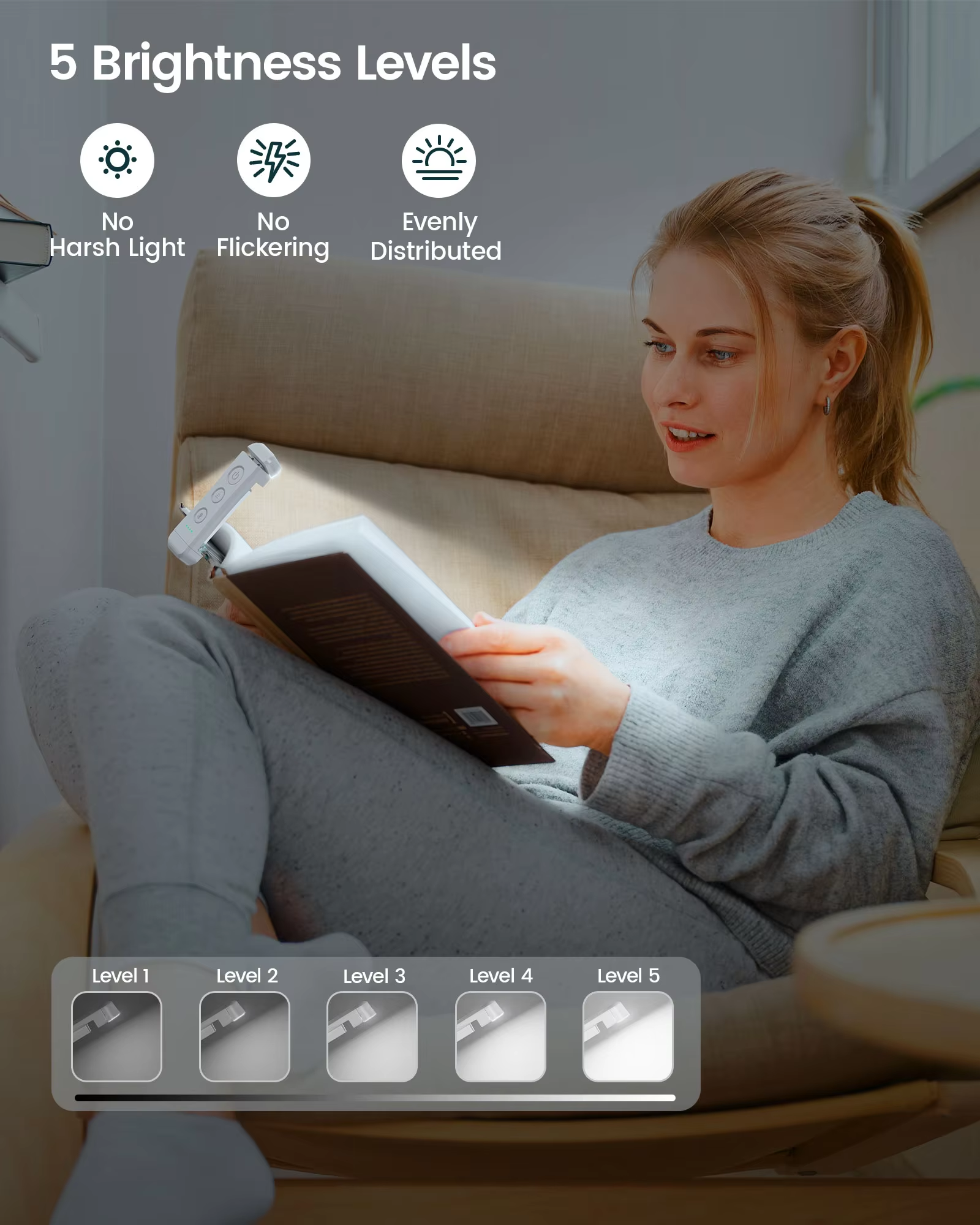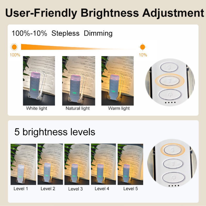 5 Brightness Levels Adjustable:This small book light offers 5 brightness levels to choose from, allowing you to select the one that best suits your eyes. The reading light will remember your previous brightness setting, so you can enjoy the light without any hassle. Scientifically installed with 5 LED beads, the light is evenly distributed across the reading page. It's bright enough to illuminate the entire page, yet dim enough not to disturb others nearby. There's no flickering or harsh light.