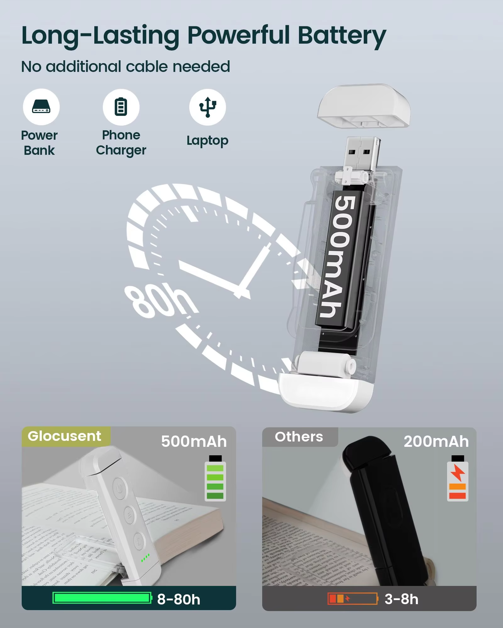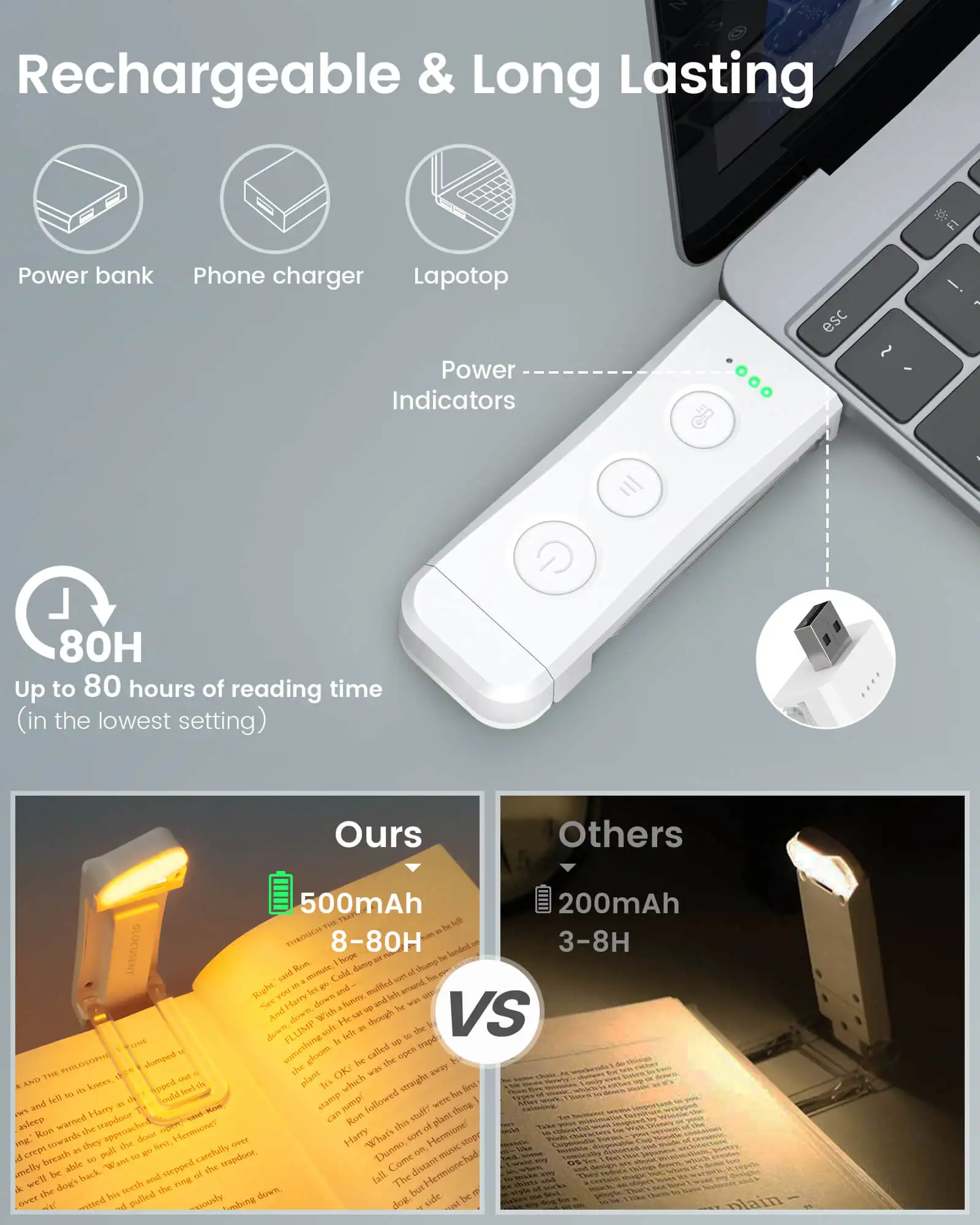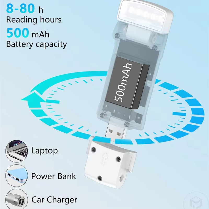 USB Rechargeable and Long-lasting: Standard USB rechargeable, compatible with any USB port on a computer, adapter, or USB socket. The built-in 500 mAh battery provides 10 to 80 reading hours (depending on your brightness setting). This means that if you read for 30 minutes a day, you can enjoy 20 days to 3 months of reading based on your settings. Additionally, there are 4 power indicators to show you the remaining power.