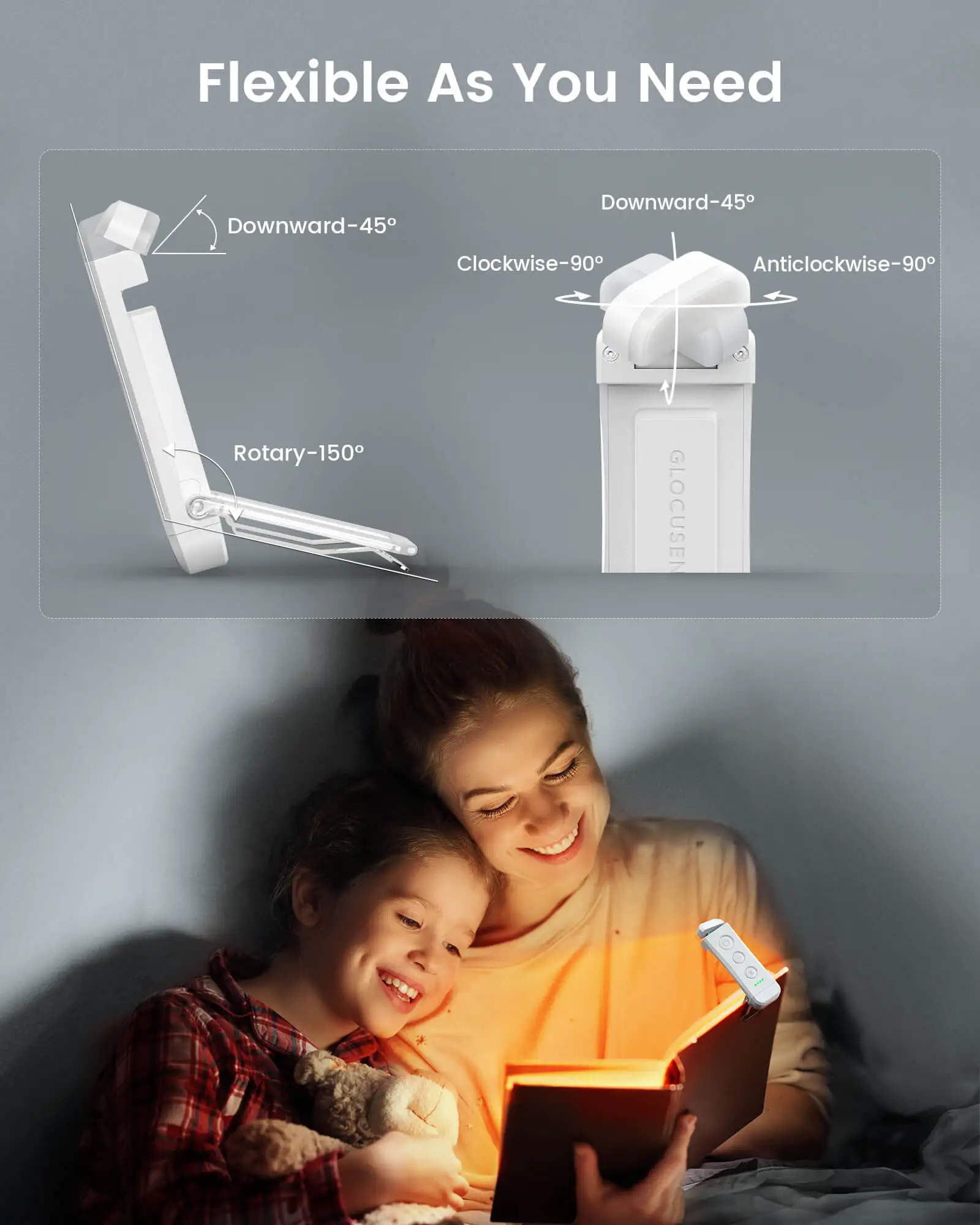 Flexible and Portable Design:The clip on the light can be opened up to 150°. The head of the light can be rotated 90° to the left, 90° to the right, and 45° downward. It is flexible enough to fit all sizes of books. You can freely adjust the angle for comfortable lighting. This book light weighs only 1.41 ounces (40 grams), much lighter than an egg. Its lightweight and compact design makes it easy to carry or clip onto a book without any effort.