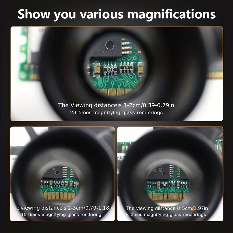🔍An ideal solution for inspecting items under a magnifying glass. With a micro-light flashlight, it can be used in dark environments. It is widely used in mechanical processing, electronic repair, jewelry identification, watch repair and micro-carving.