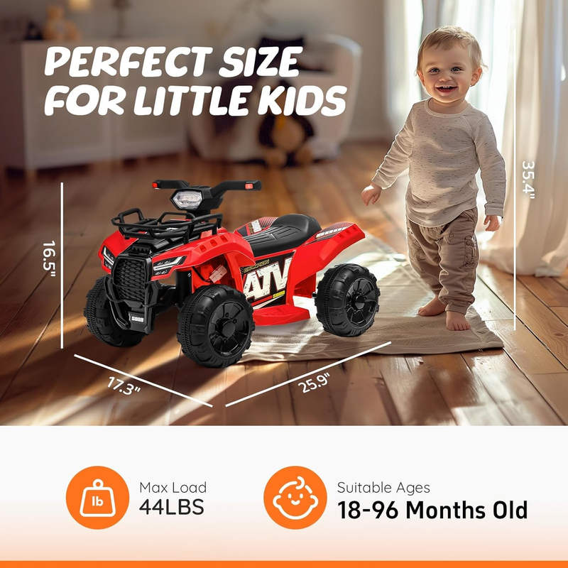Perfect Size: Suitable for children 18-96 months old and weighing up to 44 pounds. Certified by ASTM and CPSIA, this toddler atv for kids is more reliable. Overall dimensions is 25.9L"*17.3W"*16.5H". TIPS: Charge the car once a month if not used regularly to maintain battery life