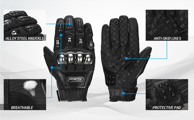 Additional Protector for Palm:Professional steel alloy protection pads created by injection moulding provide riders with thebest possible protection in the event of a crash. Ride safely by wearing protective equipment.