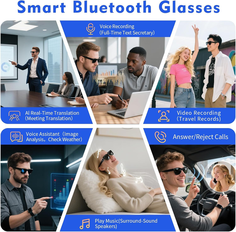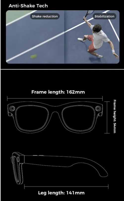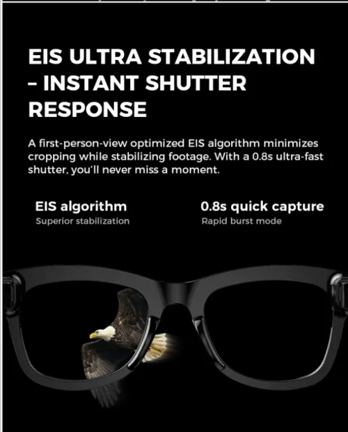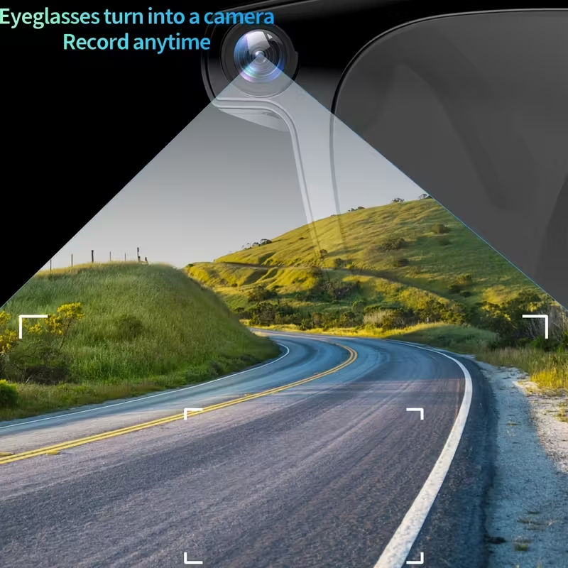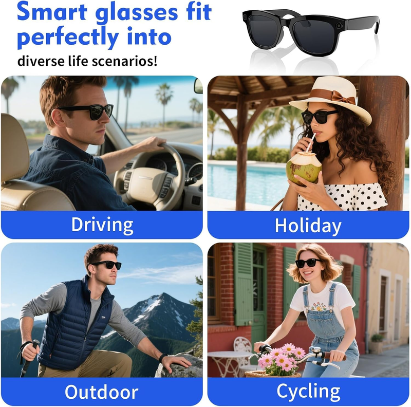 📸 HD Camera Glasses for Vlogging & Sports:Capture stable 1080p videos with 8MP wide-angle lens and EIS anti-shake. 0.8s ultra-fast shutter freezes action shots during cycling/running. One-touch recording + WiFi transfer to phone in seconds.