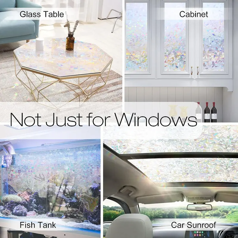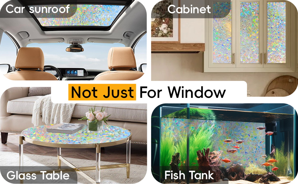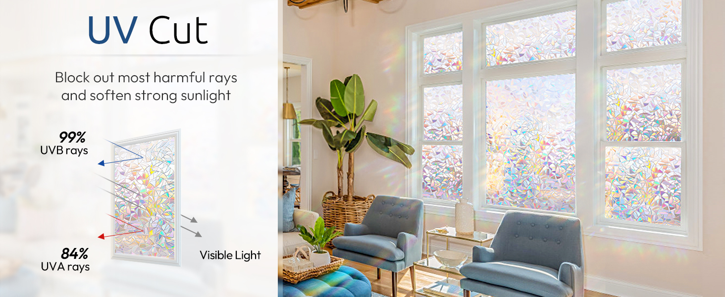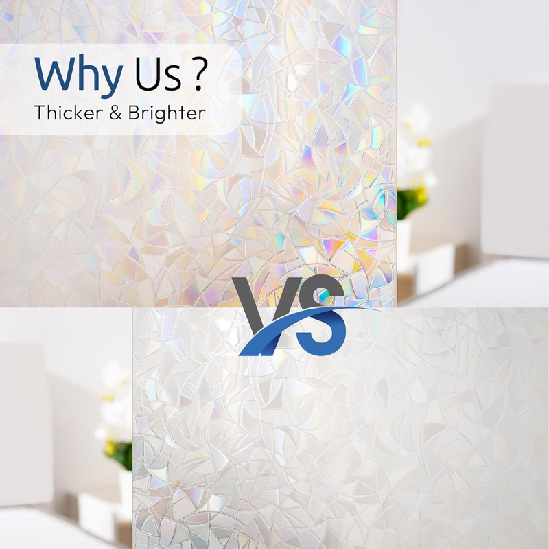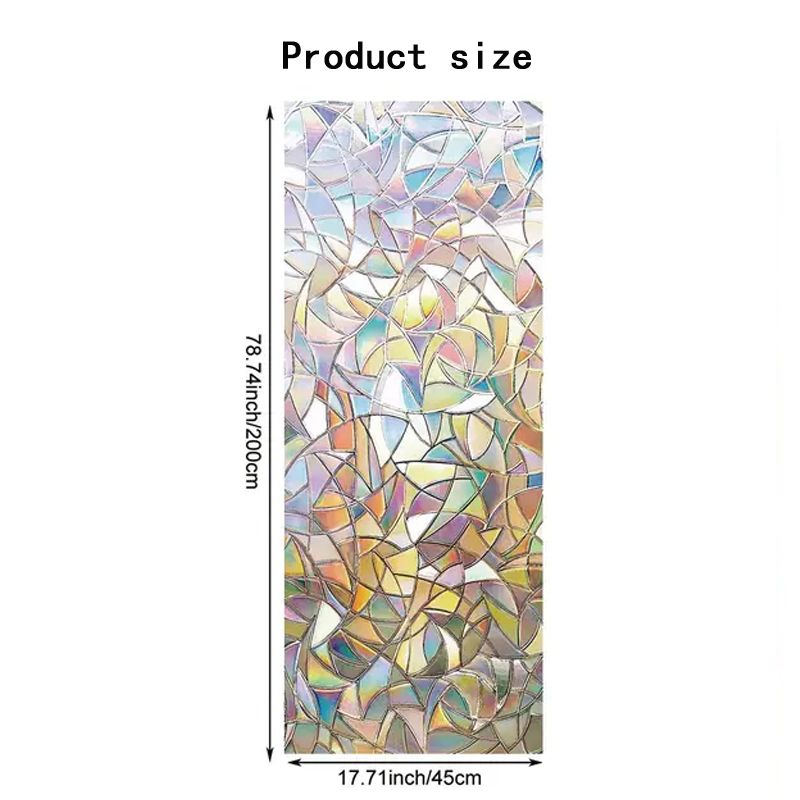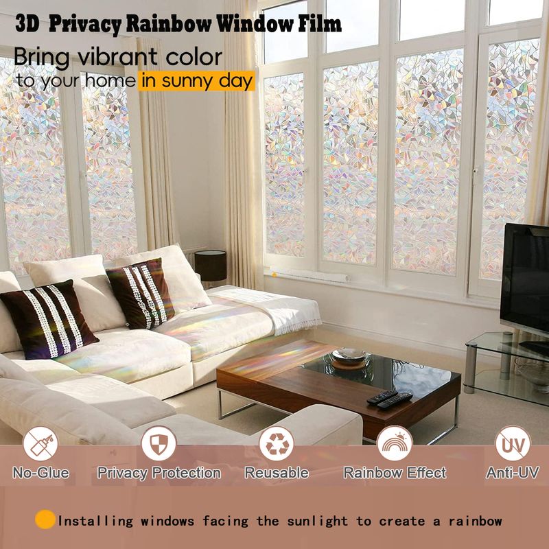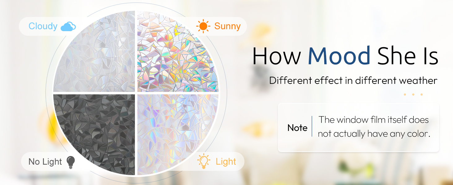 Note: 1. The decorative window film itself does not have any color, with a special 3D laser design it will show a colorful visual effect when sunlight hits it. Color change throughout the day depending on light conditions, and the more sunlight there is, the greater the rainbow effect.