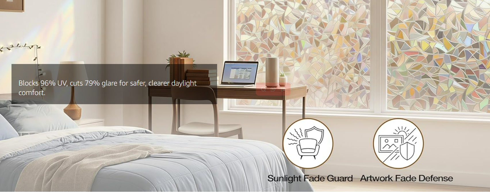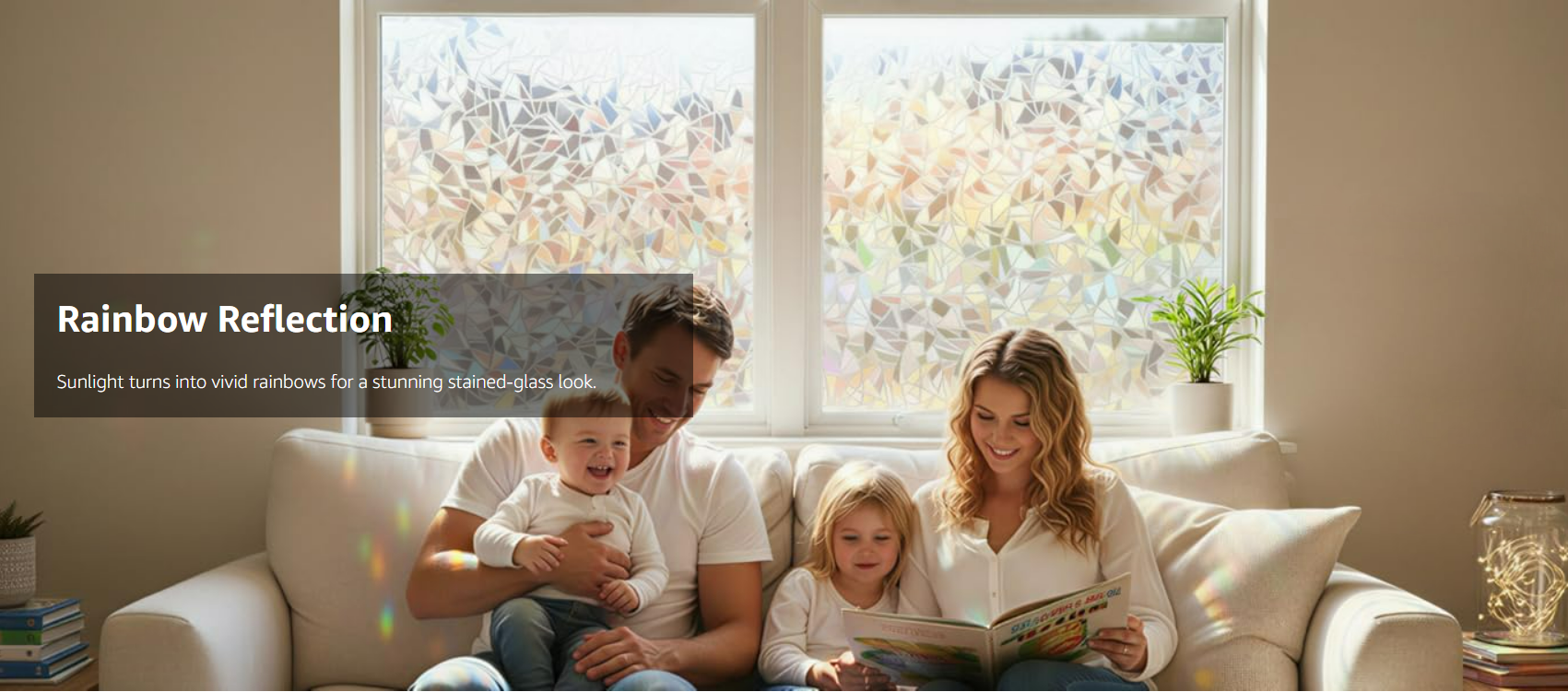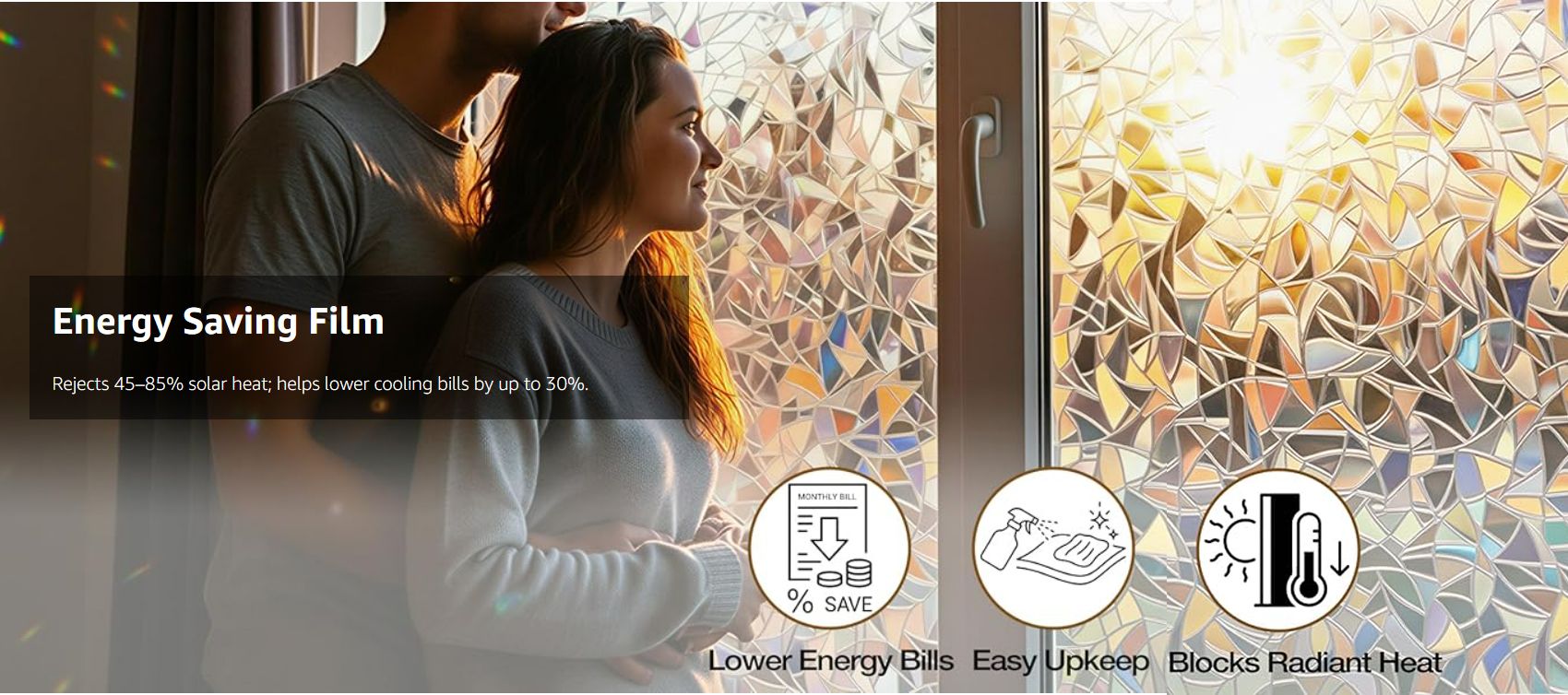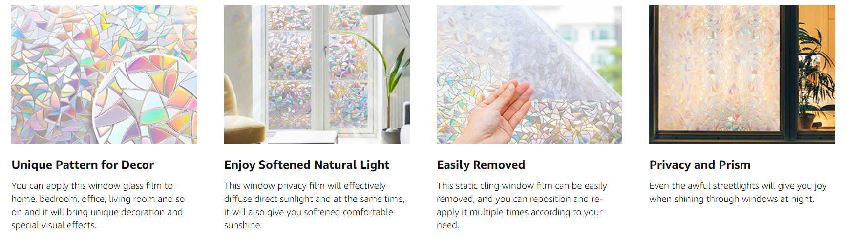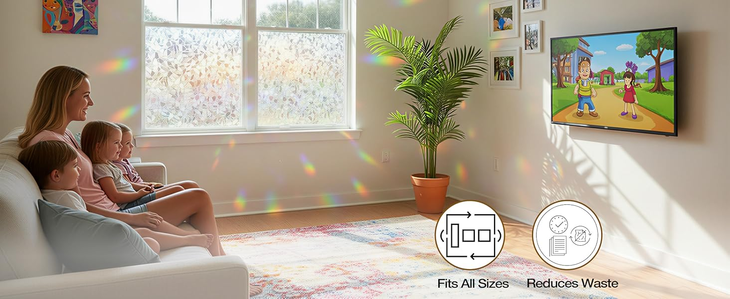 Note: 1. The decorative window film itself does not have any color, with a special 3D laser design it will show a colorful visual effect when sunlight hits it. Color change throughout the day depending on light conditions, and the more sunlight there is, the greater the rainbow effect.