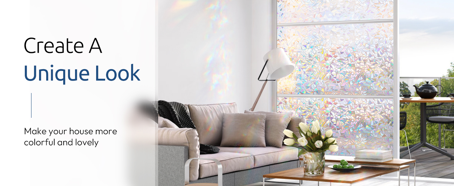 With static window privacy films, you can easily give your windows the look of frosted, etched, textured, or stained glass. Partial privacy protection blurs unwanted views, irregular 3D pattern texture decorates your personal space and creates rainbow effects when sunlight hits through.