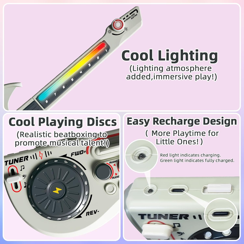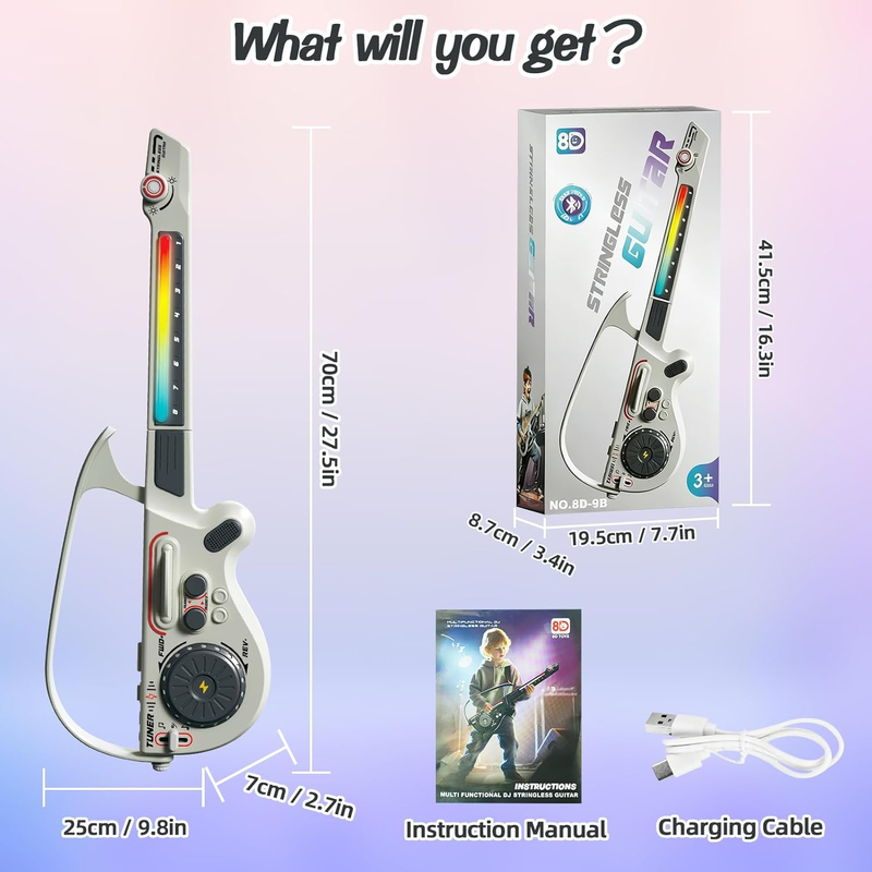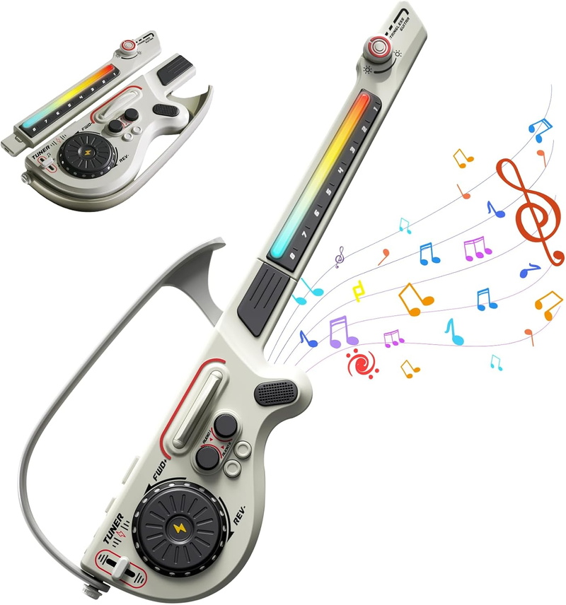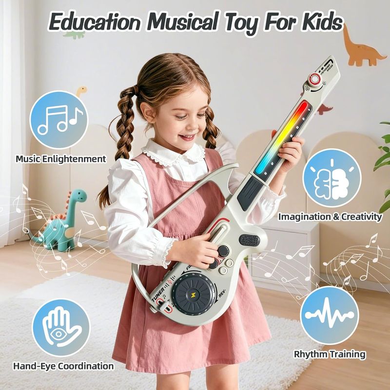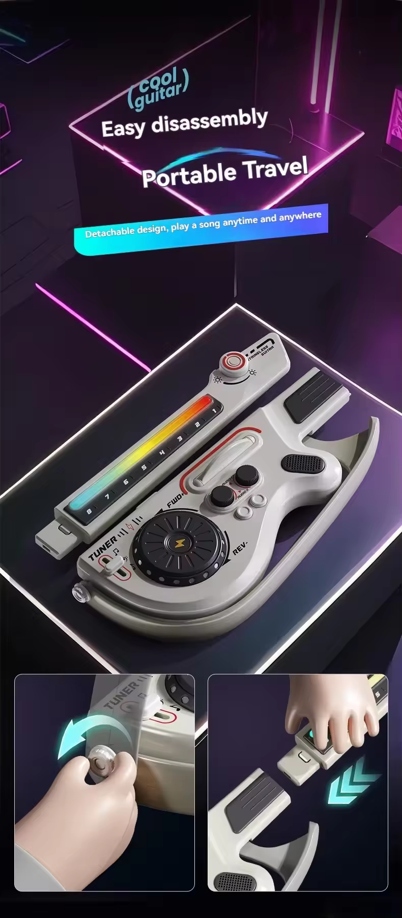 Featuring a stringless electric structure specially designed for children, it eliminates the risks of tangling and scratches caused by traditional guitar strings, making it safe for kids aged 3 and above to play with. There's no need to learn complex string-pressing techniques—kids only need to gently press the keys to produce clear and pleasant guitar sounds.