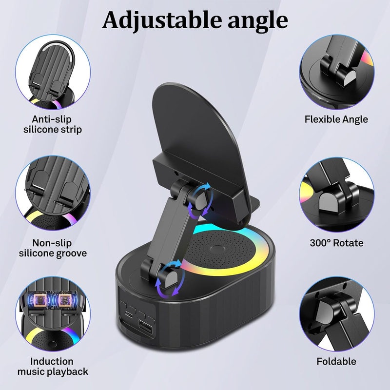 【Features a unique and fun 5-in-1 design】A multifunctional device that combines wireless induction, bluetooth speaker, charging, cell Phone Stand, and ambient light, with a built-in 4Ω5W power speaker that delivers high-definition stereo surround sound at any volume level for an enhanced audio experience. Our upgraded Bluetooth speaker comes with a USB port for charging in case of emergencies.